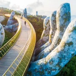 – Tham quan chụp ảnh cùng Cầu Vàng. Cây cầu được nâng đỡ bởi đôi bàn tay vững chắc, nằm giữa lưng chừng trời với độ cao hơn 1.400m sẽ khiến Quý khách vô cùng choáng ngợp bởi mức độ kỳ vĩ của không gian núi rừng vô tận.